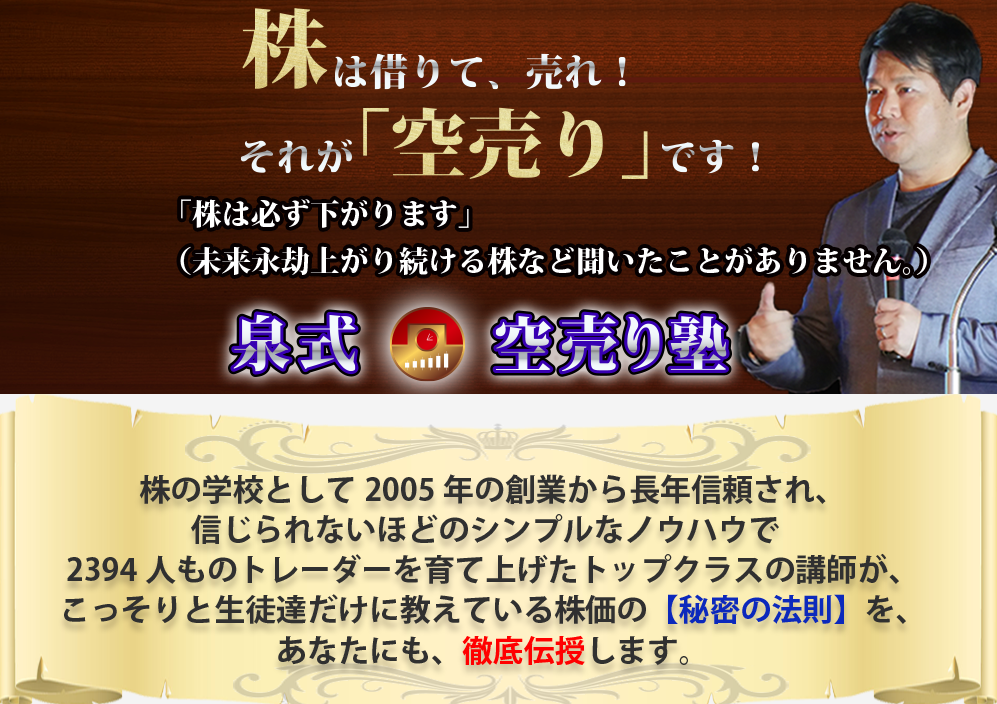 「泉式 空売り塾」は、株式投資の“空売り”に特化した教材です。