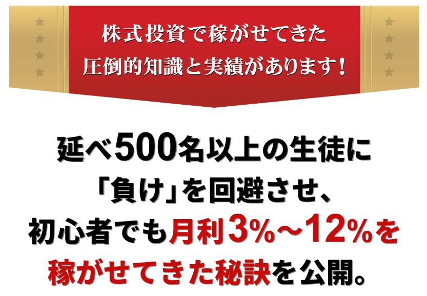 「負けゼロ投資」は、実際に500人以上の生徒を初心者でも月利3%〜12%稼がせてきた株式投資手法です。